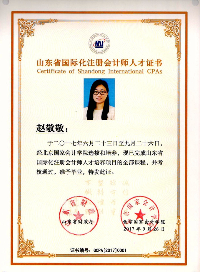 | 賀趙敬敬成為“山東省國(guó)際化注冊(cè)會(huì)計(jì)師人才”并獲得“優(yōu)秀學(xué)員”稱號(hào) |