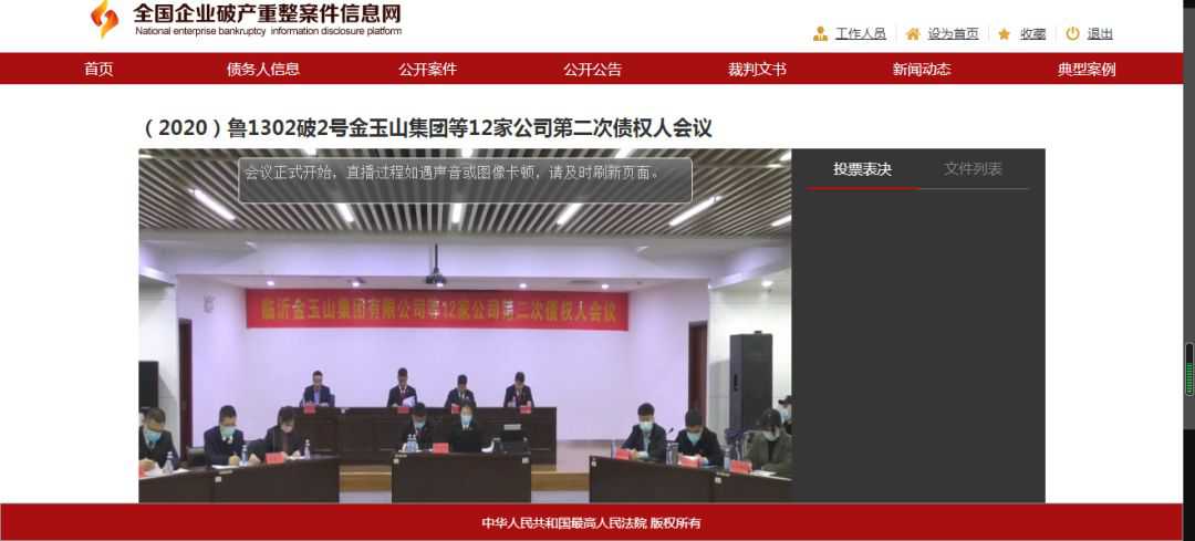 會(huì)議開(kāi)始后,由臨沂市蘭山區(qū)人民法院合議庭書(shū)記員朱靜怡宣讀會(huì)場(chǎng)紀(jì)律,會(huì)議議程第一項(xiàng):合議庭介紹案件進(jìn)展情況;第二項(xiàng):管理人代表尹昌鳳作《管理人履職工作報(bào)告》;第三項(xiàng):審計(jì)機(jī)構(gòu)代表李敏作《審計(jì)工作情況說(shuō)明》;第四項(xiàng):評(píng)估機(jī)構(gòu)代表趙常鑫作《評(píng)估工作情況說(shuō)明》;第五項(xiàng):管理人代表孔鵬作《關(guān)于補(bǔ)充申報(bào)債權(quán)核查的報(bào)告》;第六項(xiàng):管理人代表孔鵬公布《臨沂金玉山集團(tuán)有限公司等十二家公司合并重整計(jì)劃(草案)》并進(jìn)行介紹;第七項(xiàng):管理人代表范昌龍宣讀《債權(quán)人會(huì)議表決規(guī)則》;第八項(xiàng):合議庭宣讀臨時(shí)表決權(quán)決定書(shū);第九項(xiàng):山東省臨沂市沂蒙公證處宣讀第二次債權(quán)人會(huì)議線下表決結(jié)果公證情況;第十項(xiàng):未表決的債權(quán)人進(jìn)行線上表決并由管理人統(tǒng)計(jì)表決結(jié)果;第十一項(xiàng):公布表決結(jié)果,本次會(huì)議上,全部債權(quán)組表決通過(guò)重整計(jì)劃草案。歷時(shí)一年,臨沂金玉山集團(tuán)有限公司等十二家重整成功!