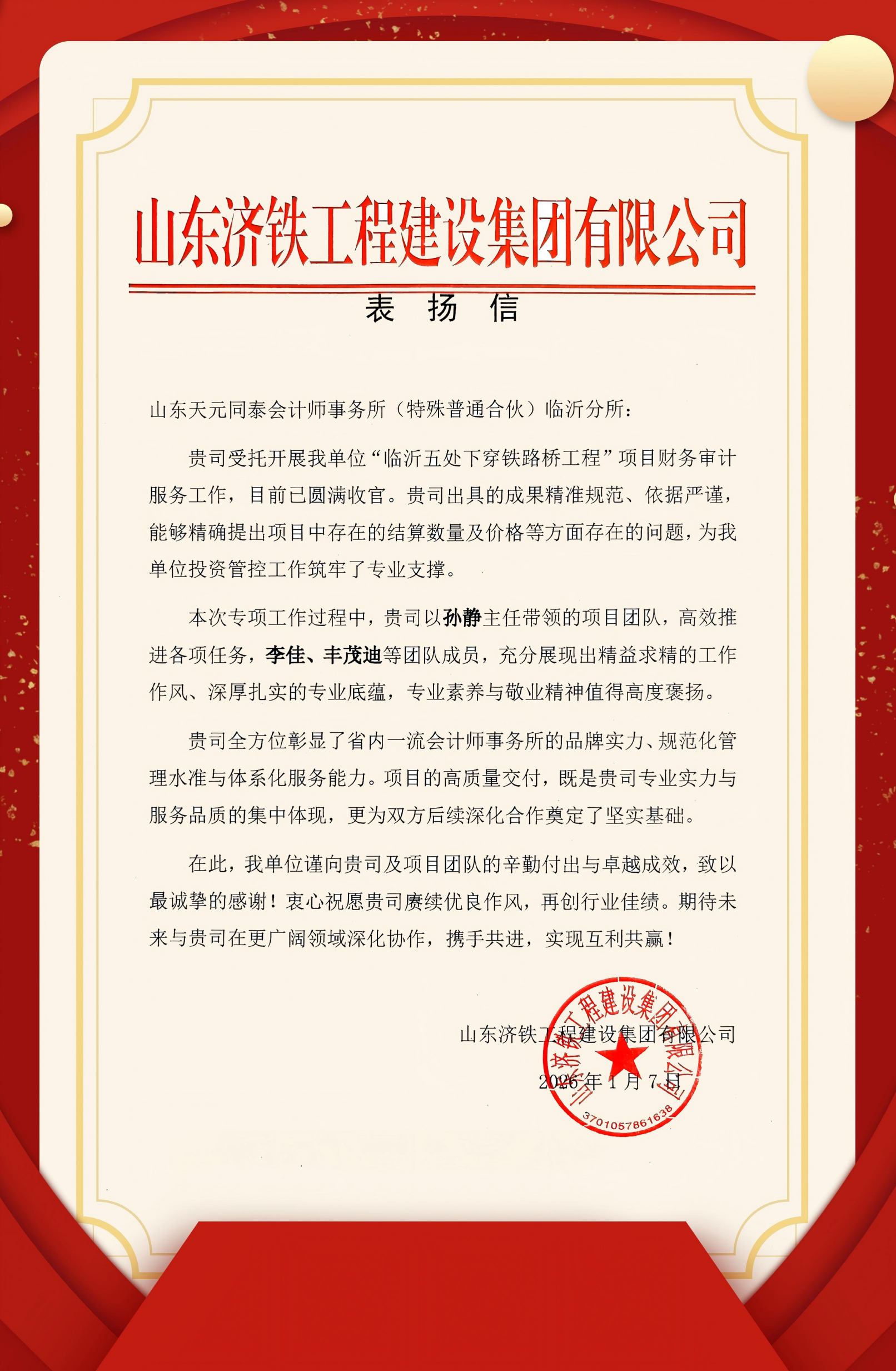 近日,山東濟(jì)鐵工程建設(shè)集團(tuán)有限公司向山東天元同泰會(huì)計(jì)師事務(wù)所(特殊普通合伙)臨沂分所發(fā)出表揚(yáng)信,對(duì)在“臨沂五處下穿鐵路橋工程”項(xiàng)目財(cái)務(wù)審計(jì)服務(wù)中的卓越表現(xiàn)給予高度評(píng)價(jià)。 本次專項(xiàng)工作過程中,以孫靜主任帶領(lǐng)的項(xiàng)目團(tuán)隊(duì)高效推進(jìn)各項(xiàng)任務(wù),李佳、豐茂迪等團(tuán)隊(duì)成員展現(xiàn)出精益求精的工作作風(fēng)和深厚扎實(shí)的專業(yè)底蘊(yùn),其專業(yè)素養(yǎng)與敬業(yè)精神得到了客戶的高度褒揚(yáng)。 信中充分肯定了臨沂分所項(xiàng)目團(tuán)隊(duì)的專業(yè)能力與服務(wù)精神,贊揚(yáng)其成果精準(zhǔn)規(guī)范、依據(jù)嚴(yán)謹(jǐn),在結(jié)算數(shù)量與價(jià)格等方面提出精準(zhǔn)問題,為項(xiàng)目投資管控提供了堅(jiān)實(shí)支撐。 山東濟(jì)鐵工程建設(shè)集團(tuán)在信中表示,天元同泰臨沂分所“全方位彰顯了省內(nèi)一流會(huì)計(jì)師事務(wù)所的品牌實(shí)力、規(guī)范化管理水準(zhǔn)與體系化服務(wù)能力”,并期待未來在更廣闊領(lǐng)域深化協(xié)作,實(shí)現(xiàn)互利共贏。