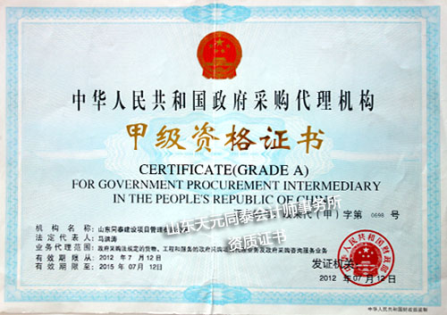 國家財政部批準(zhǔn)的政府采購代理甲級資格